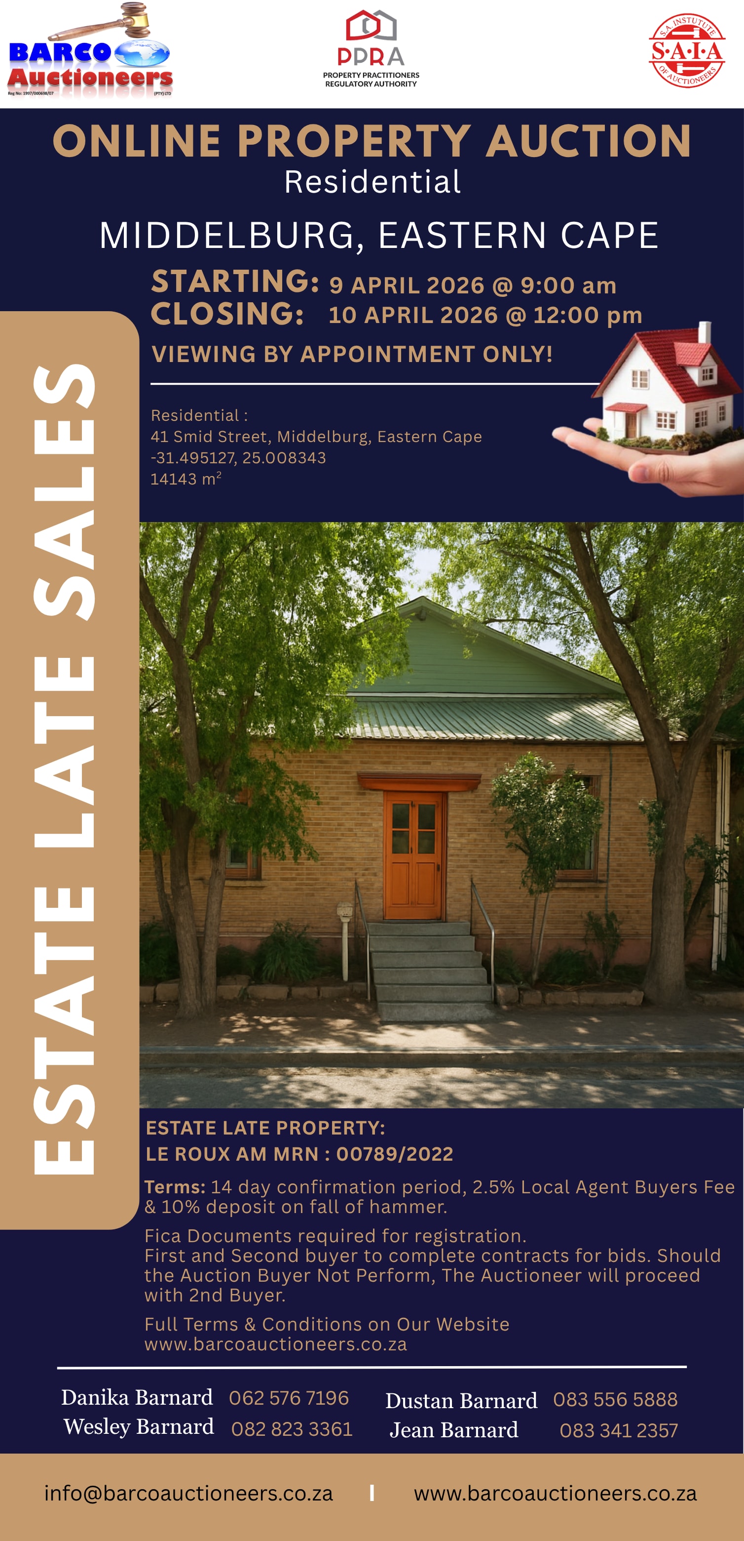 ๐๐๐ซ๐๐จ ๐๐ฎ๐๐ญ๐ข๐จ๐ง๐๐๐ซ๐ฌ invites you to participate in an ๐๐๐๐๐๐ ๐๐๐๐๐๐๐๐๐๐ ๐๐๐๐๐๐๐ featuring residential and commercial property in Middelburg, Eastern Cape.